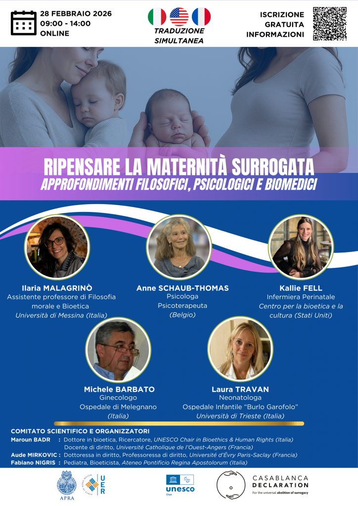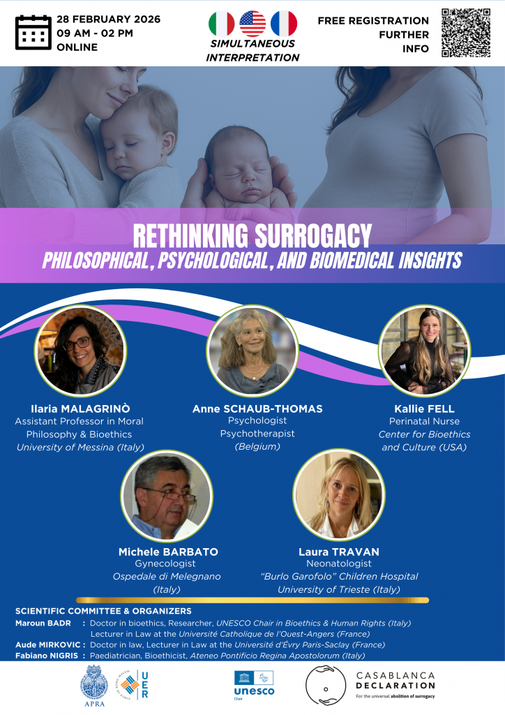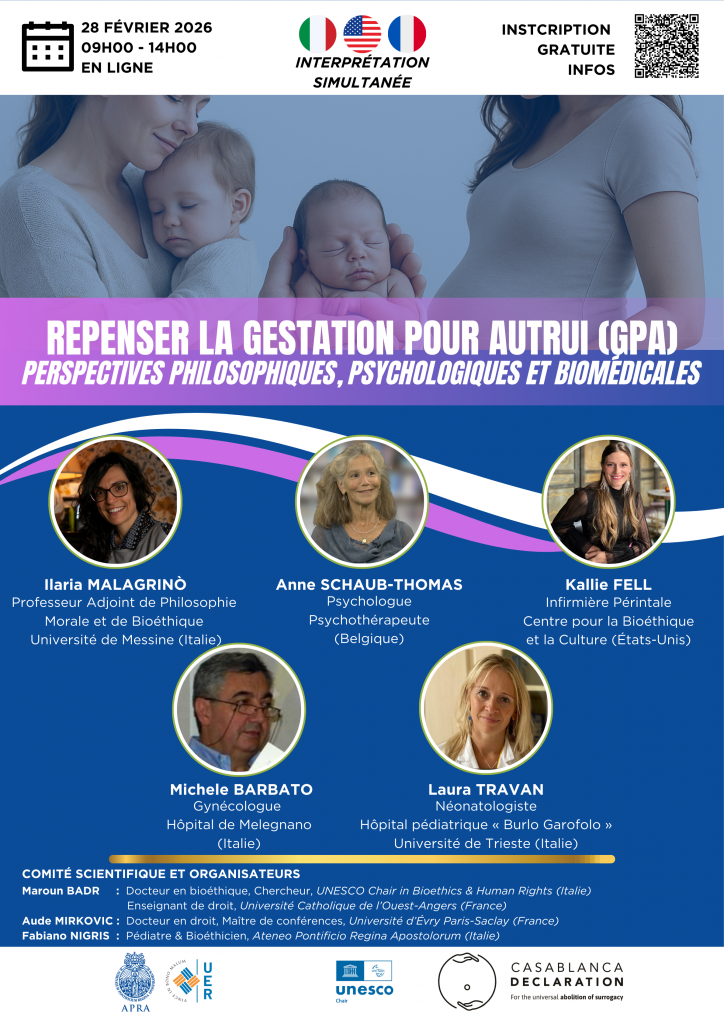 La gestation pour autrui (GPA) constitue aujourd’hui un enjeu scientifique, éthique et sociétal majeur. Ce colloque international en ligne réunit des spécialistes issus des domaines philosophique, psychologique et médical pour explorer les multiples dimensions de cette pratique en pleine expansion.